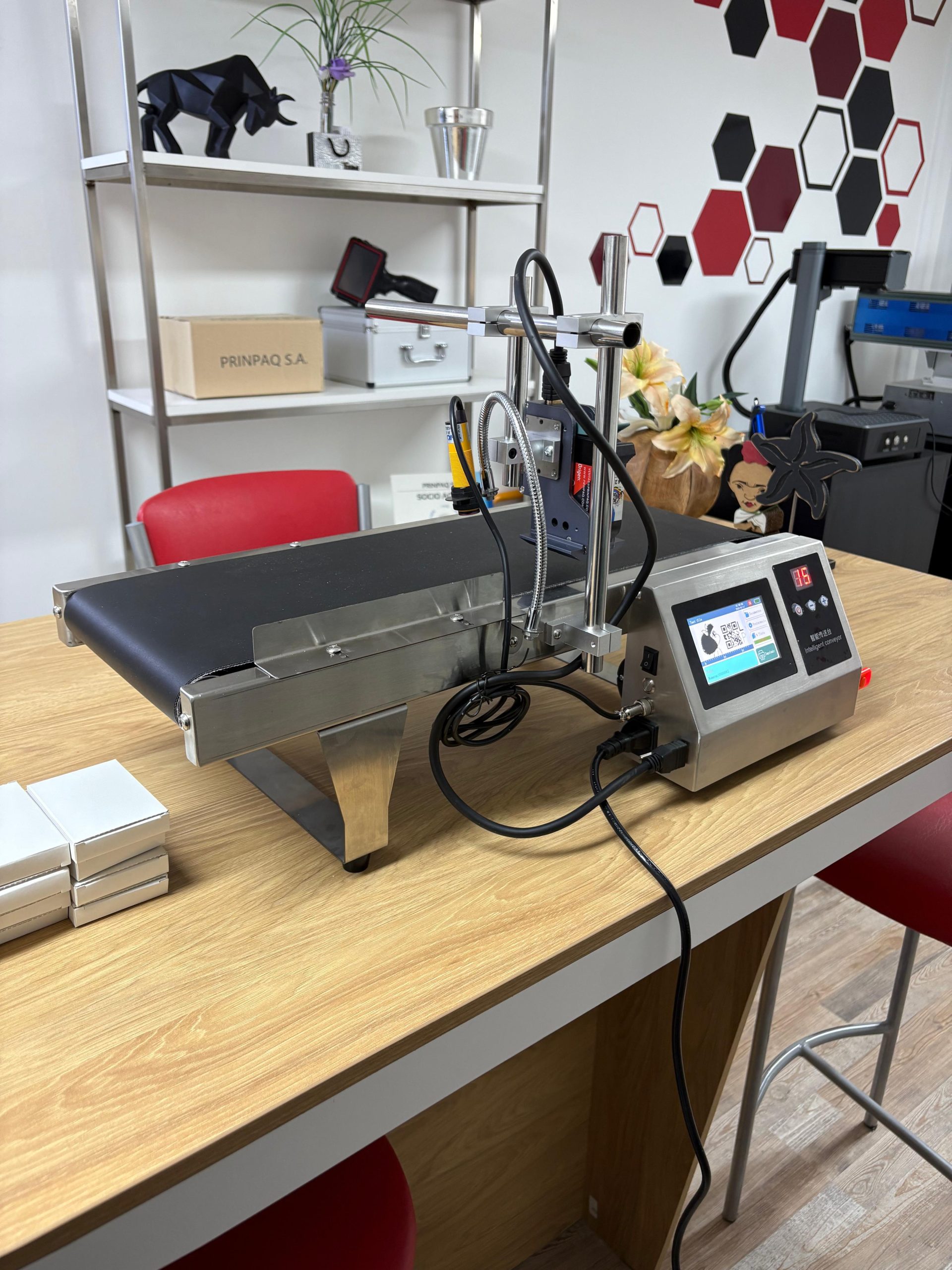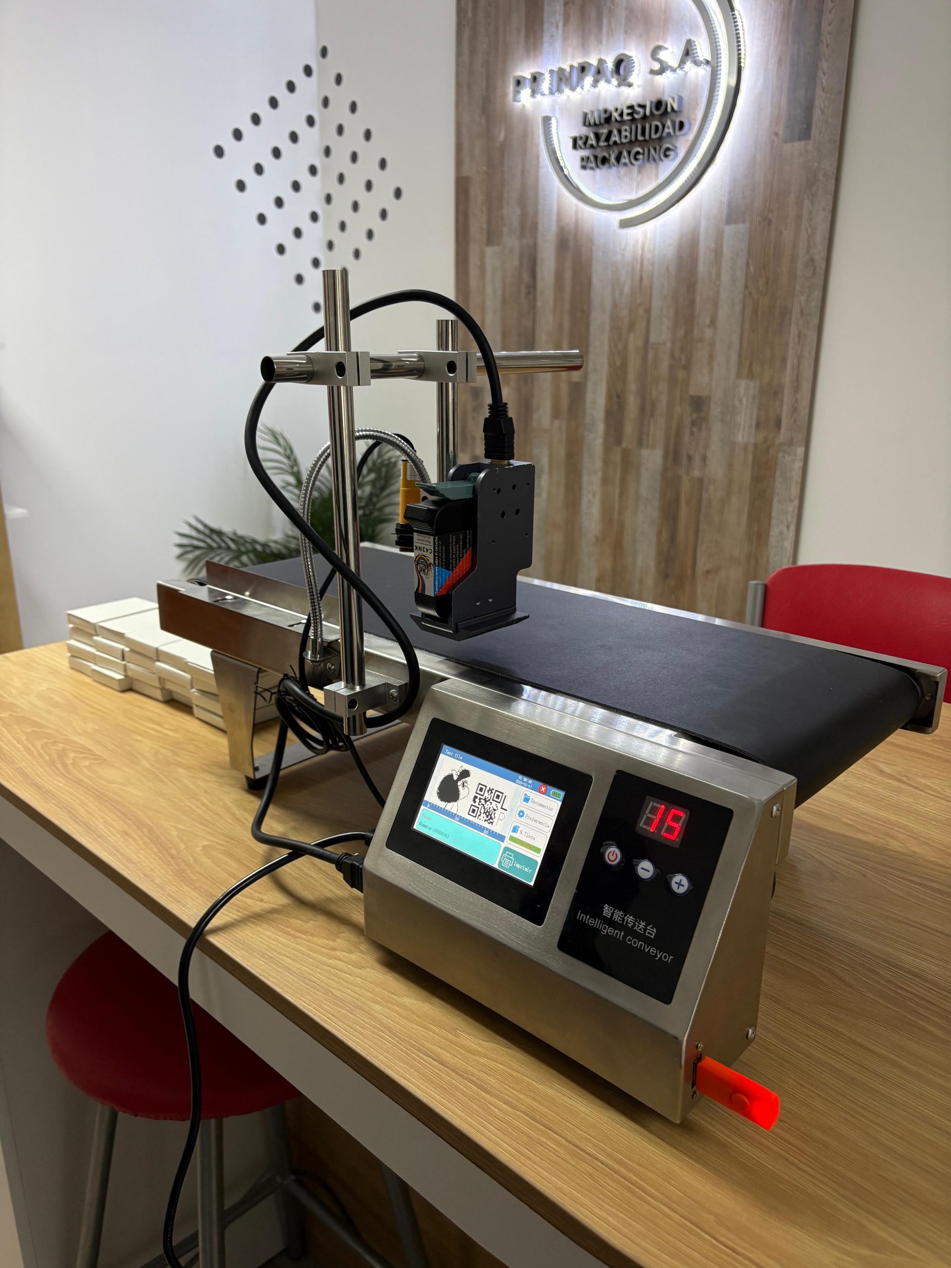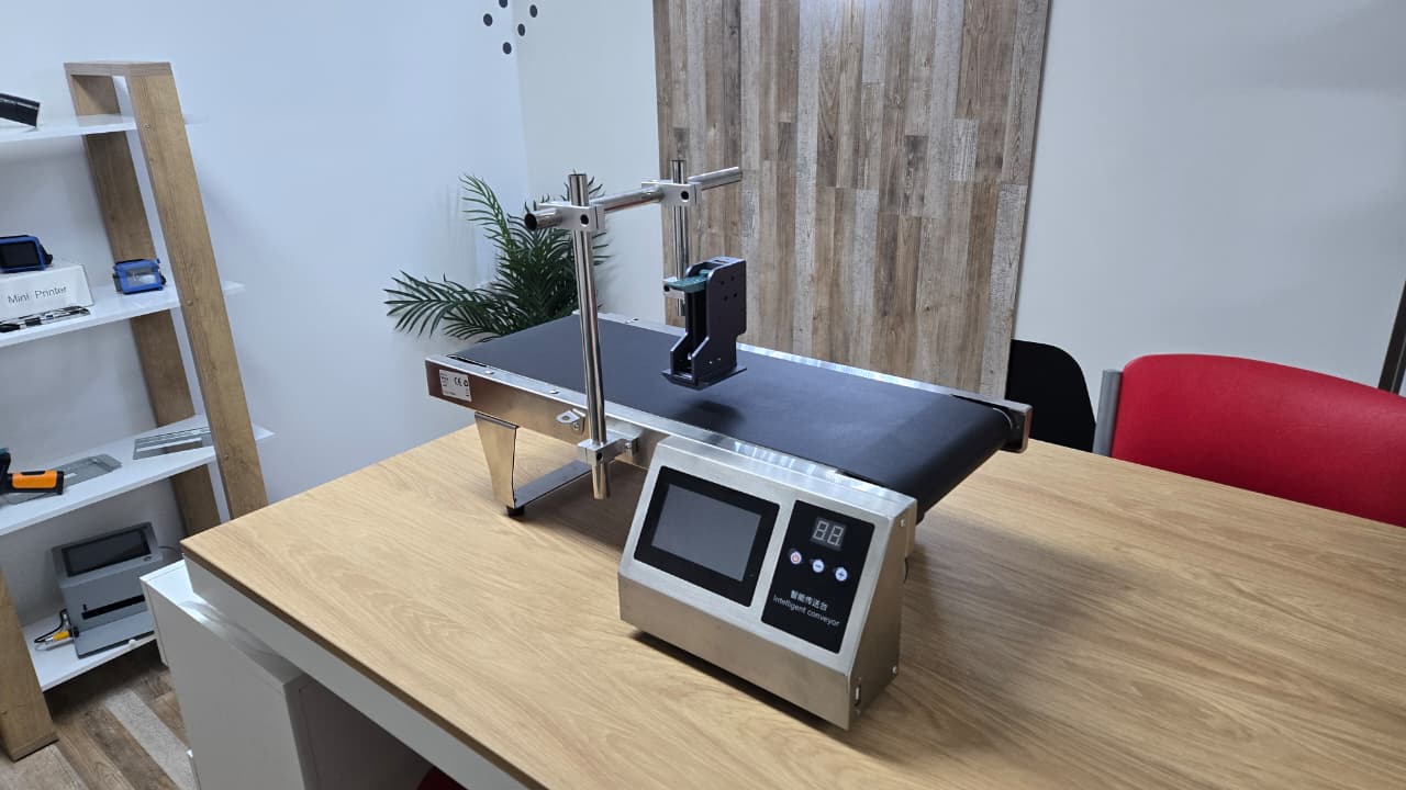 Cinta de transporte con impresora codificadora incluida.